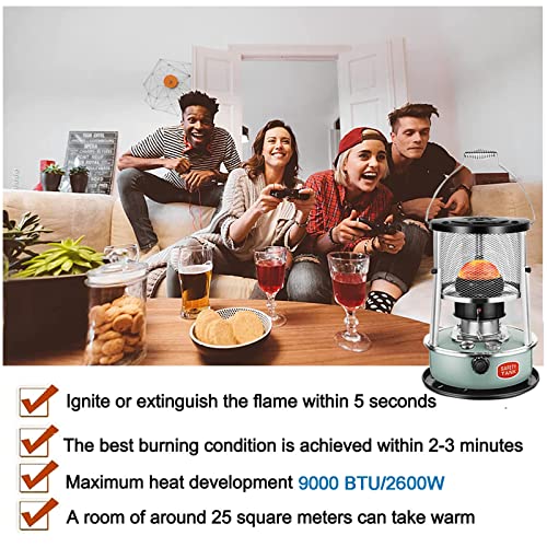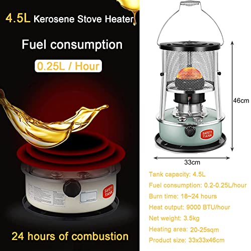 - 【Effizientere Petroleum Heizung】Der Verbrennungswirkungsgrad der Petroleumheizung beträgt 99,8 %, einem Ölverbrauch von 0,2-0,25L pro Stunde sowie einer längeren Heizzeit von 18-24 Stunden. Der petroleumofen bis zu 9000 BTU (2600W) Heizleistung liefern und einen Raum von 15-20㎡ beheizen. Fassungsvermögen: 4,5L.