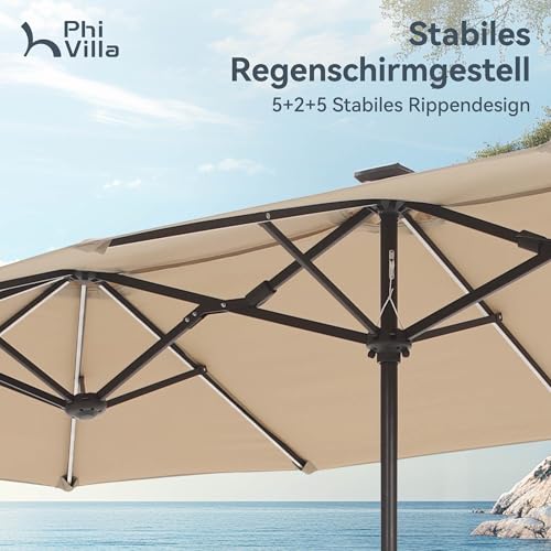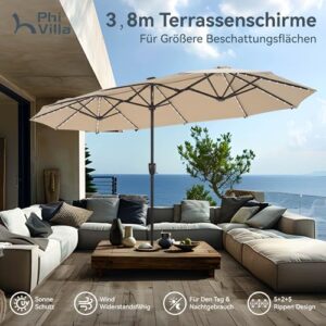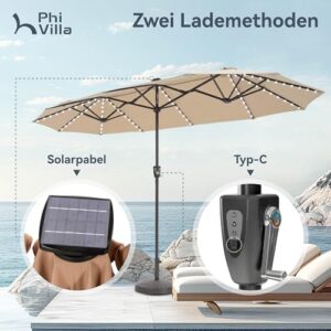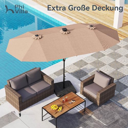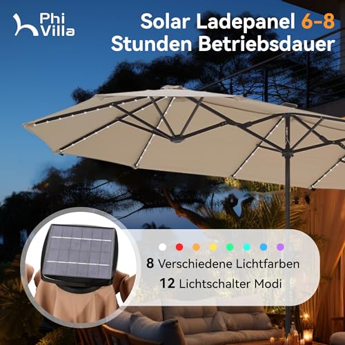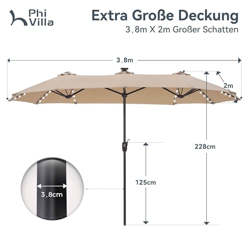 - Extra große Patio beleuchteten Sonnenschirm: PHI VILLA dieser 2x3,8m große Terrassenschirm verfügt über ein doppelseitiges Design, das Ihnen maximalen Schutz bietet, der Ihnen große Schatten für Ihr Outdoor-Vergnügen bringt. Perfekt geeignet für Wohn- und Geschäftsräume