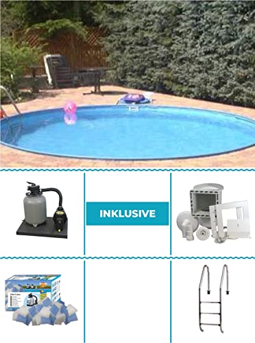 - Lieferumfang: Kombi PVC-Handlauf, Bodenschiene, Stahlwand 0,8mm, Folie 0,6mm blau, Skimmer inkl. Düse, 38mm Schlauch, Tiefbeckenleiter Edelstahl, Sandfilter 6m³/h inkl. Filtercubes