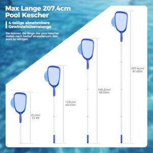 - 【Einstellbare Länge】Das Pool Kescher enthält 4 abnehmbare Aluminiumstangen und 1 Netzrahmen. Die Gesamtlänge des Reinigungs Kescher beträgt 207cm(einschließlich der Rahmenlänge). Die vier Aufbauteile ermöglichen es Ihnen, den Stab in vier verschiedenen Längen anzupassen: 83 cm, 123 cm, 165 cm und 207 cm, indem Sie einfach die gewünschte Anzahl von Teilen verbinden.