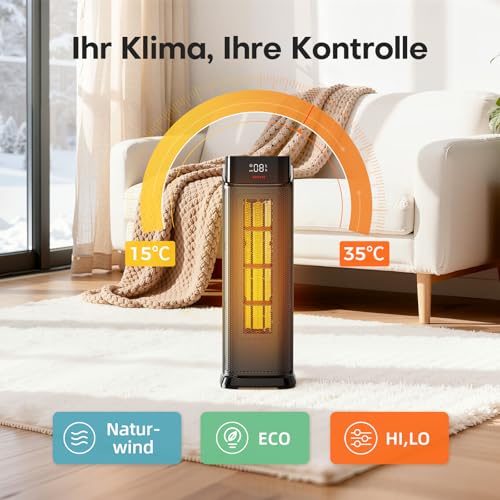 - Individuelle Heizbedürfnisse: Im ECO-Modus hält der elektroheizung die Raumtemperatur zwischen 15 und 35 °C dank Thermostatregelung. Alternativ stehen drei weitere Modi (HI, LOW, Natural Wind) zur Auswahl, um den persönlichen Komfort zu garantieren