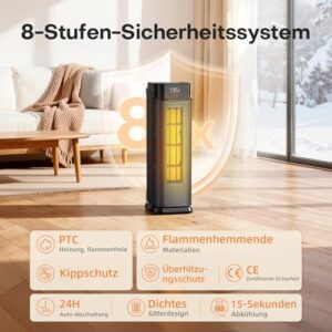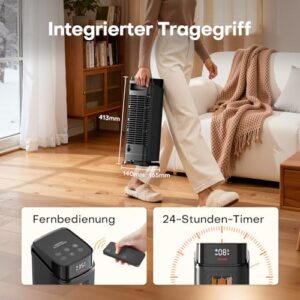 - Einfach zu Bewegen und zu Bedienen: Der heizung elektrisch verfügt über einen versteckten Griff für einfachen Transport. Einstellungen wie der 1- bis 24-Stunden-Timer können bequem über das Bedienfeld oder die Fernbedienung(Integrierte Lithium-Mangan-Knopfzelle) vorgenommen werden.