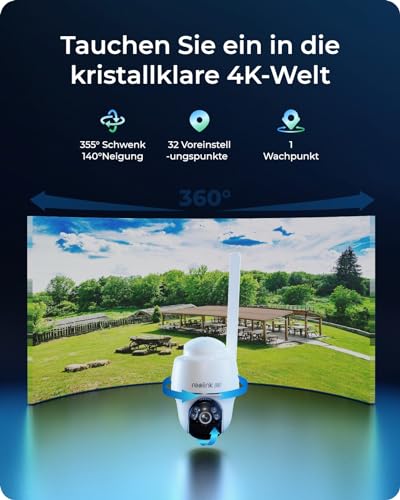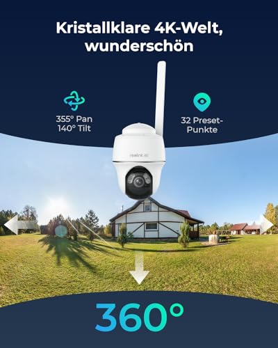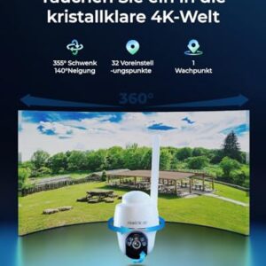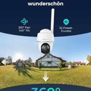 - 360° Rundumsicht: Schwenken Sie die Outdoor Kamera ohne Wlan um 355° und neigen Sie sie um 140° (Geschwindigkeit einstellbar), um Ihre Welt aus jedem Winkel zu betrachten. Richten Sie den Wachpunkt und die voreingestellten Punkte (max. 32) ein, um auf wichtige Bereiche zu fokussieren.