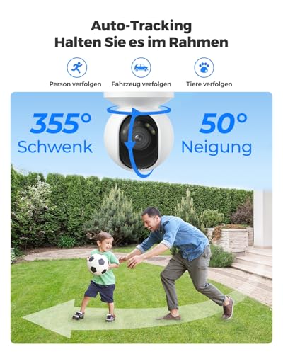 - 8MP & PTZ für mehr feine Details: Die Kamera kann schwenken (355°) und neigen (50°), um Ihnen einen 360° Blick auf die Umgebung zu ermöglichen. Die 4K Auflösung sorgt für noch klarere Details. Das optische Zoomobjektiv ermöglicht 3X Vergrößerung der Details, ohne dass die Ultra HD Qualität verloren geht.