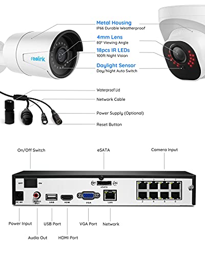 - [Kompatibel zu Reolink 4MP, 5MP und 8MP Kameras]: Durch die 8 PoE-Ports am NVR kann es mit max. 8 Reolink Kameras mit PoE, WiFi, Festobjektiv und Autofokus zusammenarbeiten, dazu gehören den 4MP, 5MP und 8MP Kameras. Sie können auch aus der Kameratypen RLC-410, 520, 510WA, 523WA, 810A, 823A, 811A und E-Serien noch 4 weitere Kameras auswählen und hinzufügen.