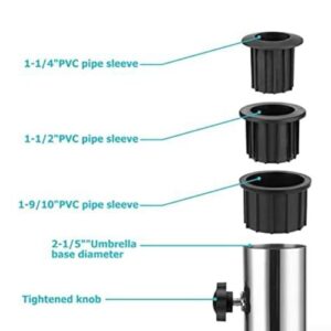 - Verstellbare Ärmel: kommt mit drei PVC-Hülsen, um verschiedene Schirmstangengrößen (1 1/4, 1 1/2 und 1 9/10) zu passen, um einen sicheren und stabilen Halt ohne Wackeln zu gewährleisten. Perfekt für die Verbesserung Ihres Terrassenschirm-Erlebnisses. Dieses Zubehör ermöglicht eine einfache Anpassung und zuverlässige Unterstützung, was es zu einer unverzichtbaren Ergänzung für Ihre Outdoor-Einrichtung macht.