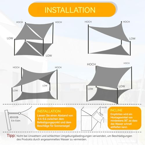- Komplett-Set zur Sofortmontage: Einfache Installation ohne Zubehörkauf.Wir liefern Ihr Segel inklusive 4x 1,5m Befestigungsseilen. Dank der robusten D-Ringe lässt sich das Segeltuch sonnenschutz schnell an Masten, Bäumen oder Wänden spannen.