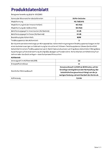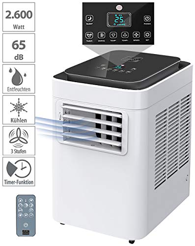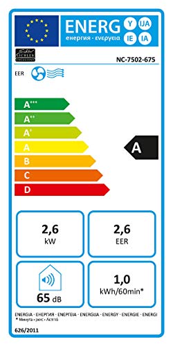 - Energieeffizienzklasse A (EER 2,6), 9.000 BTU/h • Komfort-Extras: direkte Temperaturwahl, Ein- und Ausschalt-Timer mit bis zu 24 Stunden Laufzeit, Ventilator-Funktion mit 3 Geschwindigkeiten • Raumluft-Entfeuchtung: bis zu 40 l/Tag • Schlauch-Adapter für ovale Wandöffnung: 7,2 x 20,8 cm • Verstellbares Luftaustritts-Gitter • Leistungsaufnahme im Betrieb: 1.000 Watt, Stand-by: 0,5 Watt