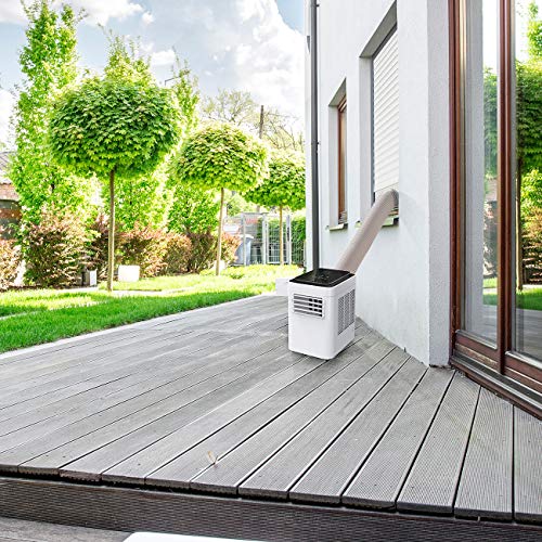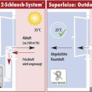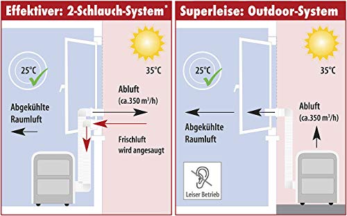 - Per optional erhältlichem Kaltluft-Schlauchadapter auch als Outdoor-Anlage einsetzbar: als Alternative zu einer Split-Klimaanlage • Bequeme Programm- und Temperaturwahl per Bedienpanel und Fernbedienung • Selbst-evaporierendes System: kondensiertes Wasser kühlt den Kondensator • Flexibler Abluftschlauch (max. Länge: 200 cm, Ø 13 cm) für feste Wandmontage oder halb geöffnetes Fenster • Maximaler Luftdurchsatz: 5,17 m³/Minute