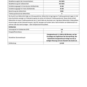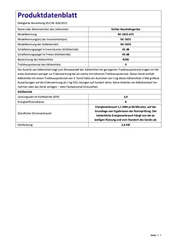- Energieeffizienzklasse A (EER 2,61), 9.000 BTU/h • Komfort-Extras: direkte Temperaturwahl, Ein- und Ausschalt-Timer mit bis zu 24 Stunden Laufzeit, Ventilator-Funktion mit 3 Geschwindigkeiten • Raumluft-Entfeuchtung: bis zu 24 l/Tag • Kühlmittel und -menge: R290, 235 g • Flexibler Abluftschlauch (max. Länge: 160 cm, Ø 15,5 cm) für feste Wandmontage oder halb geöffnetes Fenster • Maximale Kühlleistung: 2.600 Watt