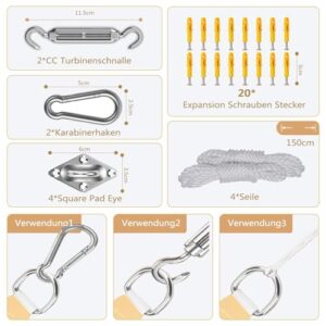 - Einfache Installation - Sonnensegel lässt sich schnell und einfach installieren. Das Set enthält alles, was Sie benötigen: 4 Polsterösen, 2 Karabiner, 2 Spannschrauben, 16 Metallschrauben, 16 Expansionsschrauben und 4 Seile. Befestigen Sie das Sonnensegel problemlos an Wänden, Zäunen, Säulen oder Bäumen – im Handumdrehen einsatzbereit.