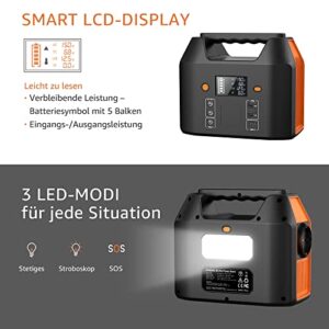 - 【Tragbare Powerstation】 99 WH Kraftwerk, 3 USB-Ausgänge (1 USB-C), 1 AC 150W MAX, 2 DC 12V-Ausgänge (nicht konstant). 27000 mAh Mobiler Stromspeicher, lädt ein iPhone (3800 mAh) ca. 6-7 mal auf, eingebaute 3 W LED-Lichtquelle, perfekte tragbare Stromversorgung zur Verlängerung Ihrer Outdoor-Campingzeit oder als Notstromversorgung bei Stromausfällen.