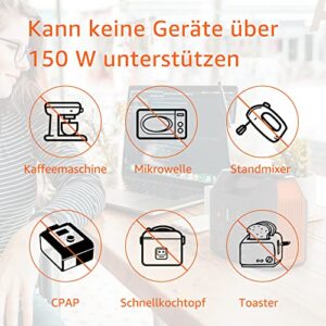 - 【Wichtiger Hinweis zur Kompatibilität】230 V Akku mit Steckdose, nur AC-Ausgang 150 W max., DC-Ausgang 120 W max.; der Generator unterstützt viele kleine Geräte unter 150 W. Kann keine Heizungen oder motorisierte Geräte betreiben, da die Spitzenleistung solcher Geräte 150 W überschreiten kann, was zu einer automatischen Abschaltung führt.