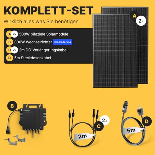 - 𝗣𝗿𝗲𝗺𝗶𝘂𝗺 𝗕𝗮𝘂𝘁𝗲𝗶𝗹𝗲 - Das 1000W Balkonkraftwerk besteht nur aus hochwertigen Bauteilen. 2x bifaziale 500W Tongwei TWMNH54HD Solarmodule, 1x Growatt NEO 800W Wechselrichter, 2x 2,0m Verlängerungskabel, 1x 5m Kabel zur Steckdose & 1x Wechselrichterhalterung.