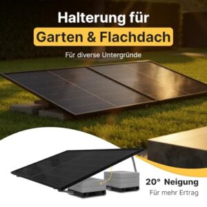 - 𝗚𝗮𝗿𝘁𝗲𝗻 & 𝗙𝗹𝗮𝗰𝗵𝗱𝗮𝗰𝗵 𝗛𝗮𝗹𝘁𝗲𝗿𝘂𝗻𝗴 - Die Photovoltaik Komplettanlage wird mit einer universellen Halterung für Ihren Garten oder Flachdach geliefert. Die Halterung kann kinderleicht mit Gewichten oder Steinen beschwert werden. Der Winkel beträgt 20°.