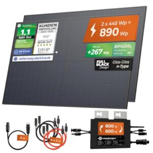 - Premium Komponenten - Bestandteile dieses Solarkraftwerks sind: 2 x 445W Bifaziale Glas/Glas n-Type Solarmodule in FULL BLACK, 1 x Wechselrichter der Marke Envertech mit 800 Watt, 1 x Steckdosen-Kabel mit einer Länge von 5m, 4 x MC4-Stecker Solarkabelverlängerung