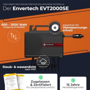 - 100% Kontrolle - Smarte Überwachung der Anlage per Wifi in der Envertech APP. Sehen Sie in Echtzeit wie viel Strom Sie erzeugen und wie viel Stromkosten und CO₂ Sie dadurch einsparen! Dank intuitiver Einrichtung innerhalb weniger Minuten startklar!