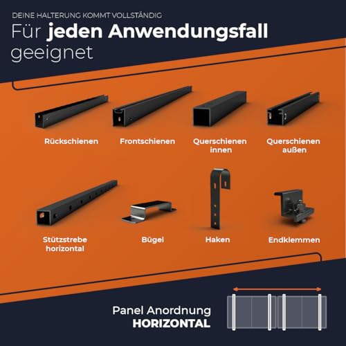 - Verschieden Solarmodul-Größen und Modelle können mit unserer Halterung befestigt werden. Generell sind Breiten von bis zu 1134mm möglich.