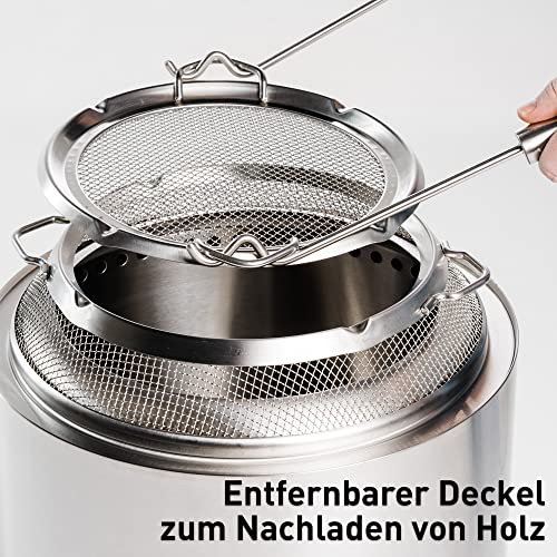 - CLEVERES 2-TEILIGE DESIGN: Dank seines 2-teiligen Designs mit abnehmbarem Deckel ist die Handhabung besonders einfach. Sie können den Deckel mithilfe der mitgelieferten Funkenschutzheber einfach und sicher entfernen, um Holz nachzulegen und das Feuer am Brennen zu halten.
