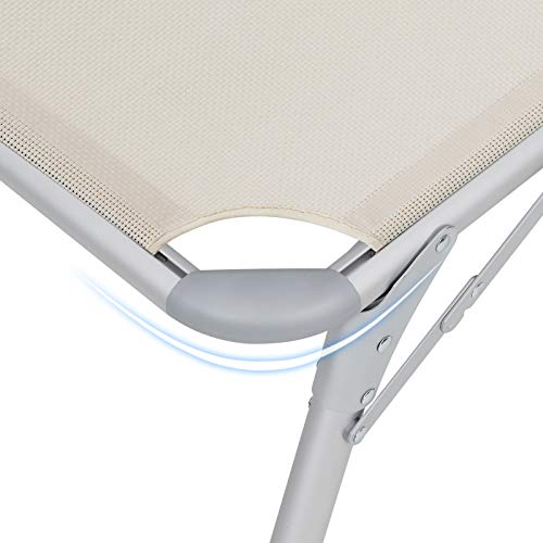 - Lange Unterstützung für den ganzen Sommer: Hergestellt aus Eisen, das mit rostfreiem Aluminium und UV-beständigem Synthetikgewebe überzogen ist, kann diese Sonnenliege bis zu 150 kg tragen. Die Sicherheitshalterungen verhindern, dass sie sich selbst falten, also machen Sie sich keine Sorgen und genießen Sie das Sonnenbad beim Nickerchen