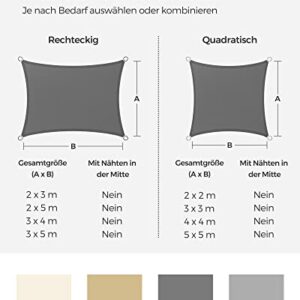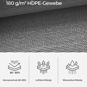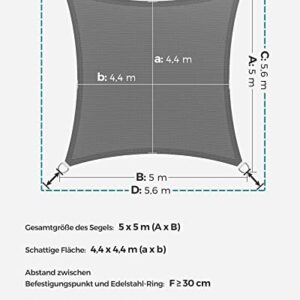 - [Luftdurchlässig & wasserdurchlässig] Dieses 5 x 5 m große Sonnensegel besteht aus 180 g/m² HDPE-Gewebe und ist luft- und wasserdurchlässig, damit sich die Sommerhitze nicht unter dem Sonnensegel anstaut. Dieses Sonnensegel eignet nicht als Regenschutz