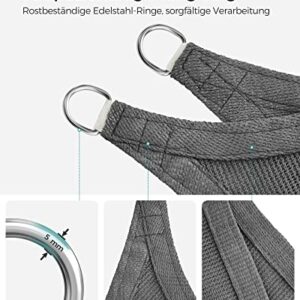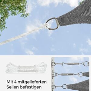 - [Zubehör & Montage] 4 jeweils 2 m lange Seile werden mitgeliefert. Es wird empfohlen, dass der Abstand zwischen dem Befestigungspunkt und dem Edelstahl-Ring des Sonnensegels mindestens 30 cm beträgt. Spannen Sie das Sonnensegel regelmäßig nach