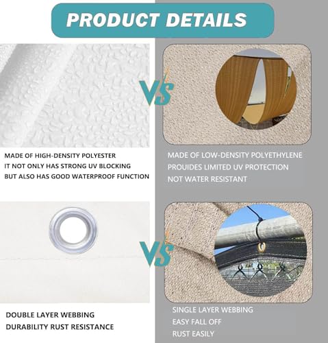 - Hohe Qualität: Sonnensegel aus 100 % hochwertigem und dichtem Polyestergewebe, kann effektiv 95 % UV-Schutz und 90 % Schattenrate erreichen. Kann die Temperatur drastisch senken und einen kühlen, komfortablen Außenbereich schaffen. dieses Outdoor-Sonnensegel ist UV-geschützt, wasserdicht, reißfest und kann erreichen.