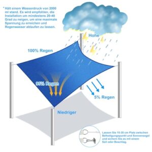 - [Atmungsaktiv und feuchtigkeitsdurchlässig] Atmungsaktives Gewebe lässt kühle Luft durch, sodass Sie die Brise genießen und kühl bleiben können; Um ein Durchhängen und Wasseransammlungen an regnerischen Tagen zu verhindern, ist das Sonnensegel regendurchlässig. Für beste Ergebnisse empfehlen wir die Installation in einem Winkel zwischen 20 und 40 Grad