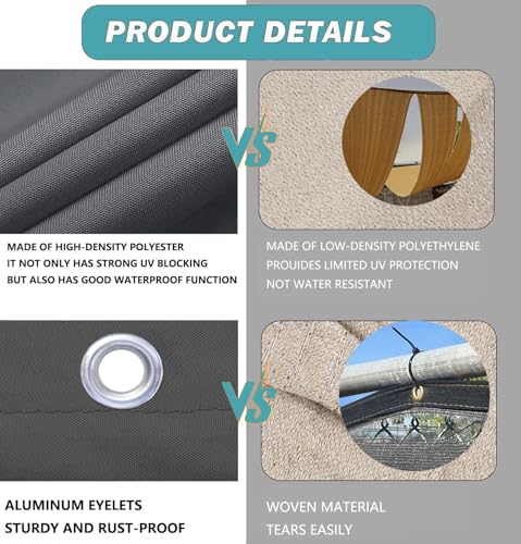 - Hohe Qualität: Sonnensegel aus 100 % hochwertigem und dichtem Polyestergewebe, kann effektiv 95 % UV-Schutz und 90 % Schattenrate erreichen. Kann die Temperatur drastisch senken und einen kühlen, komfortablen Außenbereich schaffen. dieses Outdoor-Sonnensegel ist UV-geschützt, wasserdicht, reißfest und kann erreichen.