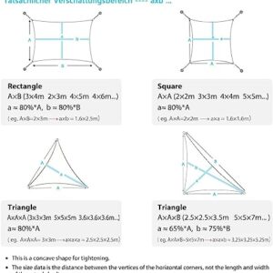 - EINFACHE MONTAGE: An jeder Ecke des Sonnensegels ist eine D-förmige Schnalle aus Edelstahl angebracht, die zusammen mit dem mitgelieferten abriebfesten Seil eine einfache Aufhängung des Segels ermöglicht. (Es wird eine leicht schräge Montage empfohlen, um eine maximale Spannung zu erreichen und Wasseransammlungen im Sonnensegel zu vermeiden).