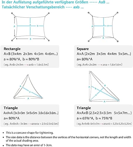 - MASS ANGEFERTIGT: Wenn Sie in unserer Größen- oder Farbliste nicht die Größe oder Farbe finden, die Sie benötigen, können Sie uns kontaktieren. Wir können Sonnensegel in jeder Größe und Farbe herstellen.