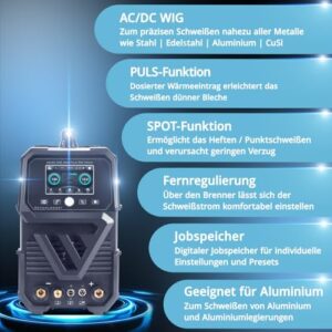 - DIGITALES TOUCH-BEDIENFELD – Das moderne Inverter-Schweißgerät verfügt über ein intuitives Touch-Display und einen Jobspeicher. Alle Parameter wie AC-Frequenz, Impulsstrom und Gasnachlauf lassen sich präzise einstellen und auf dem übersichtlichen Digitaldisplay einfach ablesen.