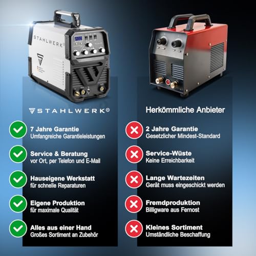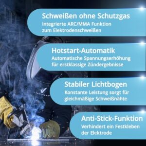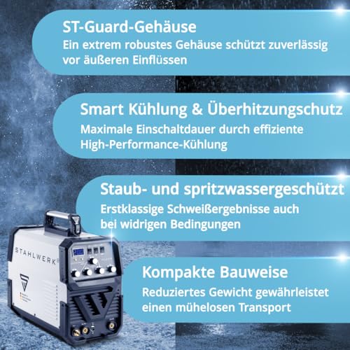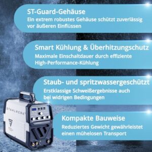 - Vielfältige Profi-Funktionen für saubere Ergebnisse: HF-Zündung, 2T/4T-Modus, individuell einstellbarer Gasvor-/nachlauf, Stromabsenkung, Hotstart, Antistick sowie Smartkühlung & integrierter Überhitzungsschutz
