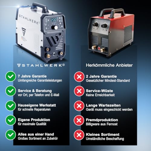 - Präzises DC WIG-Schweißen – Gleichstrom (DC) für das professionelle Schweißen von Stahl, Edelstahl, Kupfer und weiteren Metallen. Ideal für Dünnbleche und feine Arbeiten. Hinweis: Nicht für Aluminium geeignet – hierfür wird ein AC/DC-Gerät benötigt.