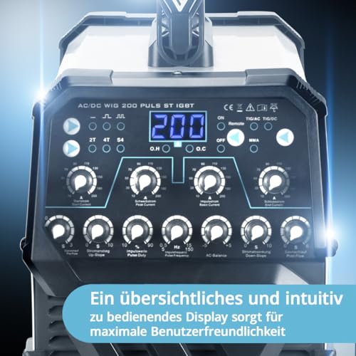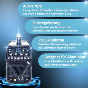 - PROFESSIONELLES AC/DC-WIG-SCHWEISSGERÄT – 200 A Schweißstrom für WIG AC/DC und MMA/E-Hand, ideal zum Schweißen von Stahl, Edelstahl, Kupferlegierungen und – dank AC-Betrieb – insbesondere Aluminium und Aluminiumlegierungen.