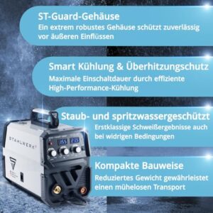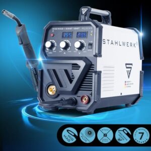 - Kompakt & funktional ausgestattet – Smartkühlung, Überhitzungsschutz, manueller Drahtdurchschub, Hotstart, Anti-Stick, nutzbar mit 1–5 kg Drahtrollen (16/50 mm), anpassbare Drahtantriebsrolle (0,6/0,8/1,0 mm).