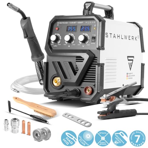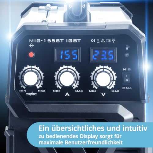 - 2-in-1 Schweißgerät MIG/MAG & MMA – Schutzgasschweißen mit DC bis 155 A, nutzbar mit inerten (MIG) oder aktiven (MAG) Gasen sowie MMA-Elektrodenschweißen; moderne IGBT-Technologie für hohe Leistung.