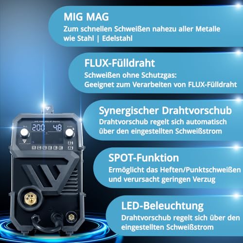 - VIELSEITIGES KOMBIGERÄT – Das 2-in-1 Schweißgerät bietet volle 200 A Leistung für MIG/MAG- und MMA/ARC-Anwendungen. Dank der FLUX-Funktion kann zudem Fülldraht verarbeitet werden, was professionelles Schweißen ohne Schutzgasflasche ermöglicht.