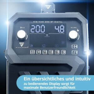 - SYNERGISCHER DRAHTVORSCHUB – Die intelligente Elektronik regelt die Drahtvorschubgeschwindigkeit vollautomatisch über den eingestellten Schweißstrom. In Kombination mit dem übersichtlichen Digital-Display und der variablen Spannungsregelung lassen sich Einbrand und Abbrand präzise auf jedes Material abstimmen.