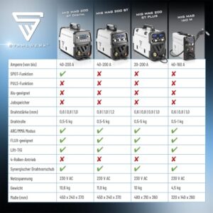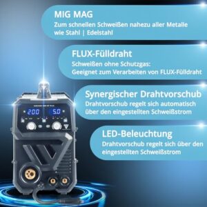 - SYNERGISCHES SCHUTZGASSCHWEISSGERÄT – Leistungsstarker 200 A Inverter für MIG/MAG-Schweißen. Der voll-synergische Drahtvorschub passt die Geschwindigkeit automatisch an den Schweißstrom an, was in Kombination mit der Drahtstärken-Vorauswahl für erstklassige Schweißergebnisse sorgt.