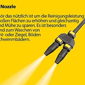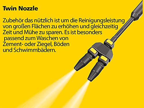 - Ausstattung mit dem innovativen TWIN NOZZLE Adapter zum Anbringen an der Lanze und Anschließen von zwei Düsen, wodurch sich der Reinigungsbereich auf das Doppelte vergrößert und man bis zu 70 % Zeit einsparen kann.