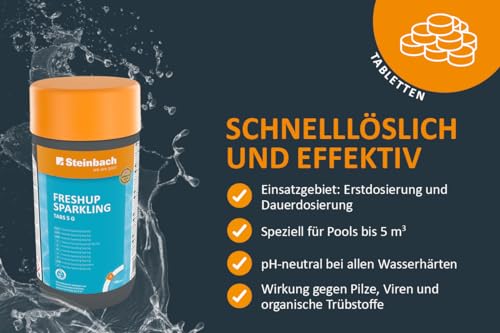 - Ideal für kleine Pools bis 5 m³: FreshUp Sparkling Tabs sind speziell für kleinere Becken konzipiert. Sie sind pH-neutral und können bei jeder Wasserhärte verwendet werden.