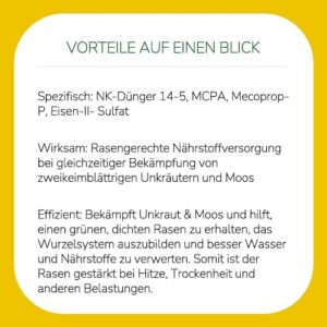 - Speziell abgestimmte Nährstoffformel: versorgen Sie Ihren Rasen optimal, während gleichzeitig unerwünschte zweikeimblättrige Unkräuter und Moos bekämpft werden.
