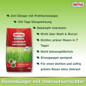 - Wirkt über Blatt und Wurzel gegen alle rasentypischen Unkräuter mit einer Langzeitdüngewirkung von 100 Tagen - keine Verbrennungsgefahr