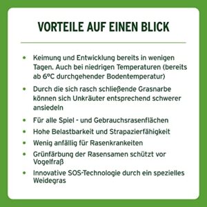 - Hochwertige Rasensamenmischung mit einzigartigen Rasensamensorten, welche extremen Belastungen standhalten kann