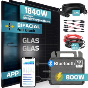 - ⭐⭐⭐⭐⭐ HOHE EFFIZIENZ: Mit einer Modulleistung von 1840 Watt und zusätzlicher bifazialer Energieausbeute, sowie einer hohen Effizienz, bietet es selbst bei schwachen Lichtverhältnissen einen hohen Energieertrag. Ausgangsleistung 800 Watt.