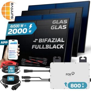 - ⭐⭐⭐⭐⭐ HOHE EFFIZIENZ: Mit einer Modulleistung von 2000 Watt und zusätzlicher bifazialer Energieausbeute, sowie einer hohen Effizienz, bietet es selbst bei schwachen Lichtverhältnissen einen hohen Energieertrag. Ausgangsleistung 800 Watt.