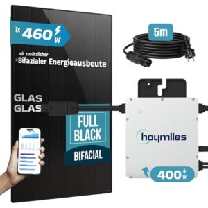 - ⭐⭐⭐⭐⭐ HOHE EFFIZIENZ: Mit einer Modulleistung von 460 Watt und zusätzlicher bifazialer Energieausbeute, sowie einer hohen Effizienz, bietet es selbst bei schwachen Lichtverhältnissen einen hohen Energieertrag. Ausgangsleistung 400 Watt.