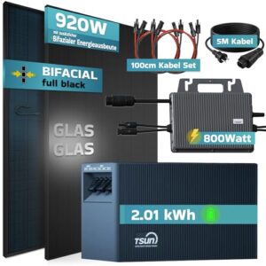 - ⭐⭐⭐⭐⭐ HOHE EFFIZIENZ: Mit 920W Modulleistung, bifazialen Solarmodulen und TSUN Speicher sorgt diese PV Mini-Anlage für effiziente Energieerzeugung, auch bei schwachem Licht. Ausgangsleistung des TSOL-MS800 Wechselrichters: 800W.
