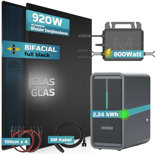 - ⭐⭐⭐⭐⭐ BALKONKRAFTWERK KOMPLETTSET: Mini-PV-Anlage mit 2x 460W bifazialen Glas-Glas Solarmodulen (Pmax 920W) und Marstek B2500-D 2,24 kWh Speicher + MST-MI0800 Mikro-Wechselrichter. Direkt über Steckdose anschließbar, sofort nutzbar für Haushaltsgeräte wie Kühlschrank, TV oder Router.